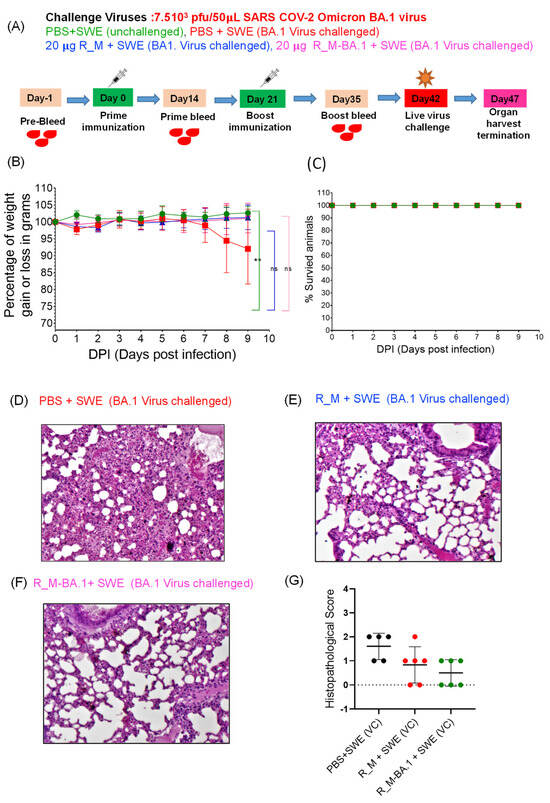 R_M protein protects immunized hACE-2-transgenic mice against heterologous Omicron (BA.1) challenge. hACE-2 expressing transgenic mice were immunized twice with SWE adjuvanted 20 µg of R_M and R_M BA.1 protein. Sub-zero protein R_M and R_M-BA.1 were thawed slowly at 4 °C and then formulated with SWE. Animals were subjected to intranasal challenge with 7.5 × 103 pfu of live SARS-CoV-2 Omicron BA.1 variant 21 days post-boost immunization. (A) A day wise immunization scheme with study group and challenge virus dose is shown in depiction. (B,C) Animal average body weight changes and % animal survival after nine days post-virus challenges are shown in two separate panels, (B) and (C), respectively. For statistical comparison, the mean of two independent groups were analyzed using Unpaired t-test (non-significant “ns” p ≥ 0.05; ** p ≤ 0.01) with GraphPad Prism 9.4.0. Each condition [green (unchallenged), blue (R_M + SWE BA.1 Virus challenged) and pink (R_M-BA.1 + SWE BA.1 Virus challenged) were independently compared with PBS+SWE (BA.1 virus challenge, red color). (D–F) Lung histopathology image at 10× magnification. (G) Histopathological score.