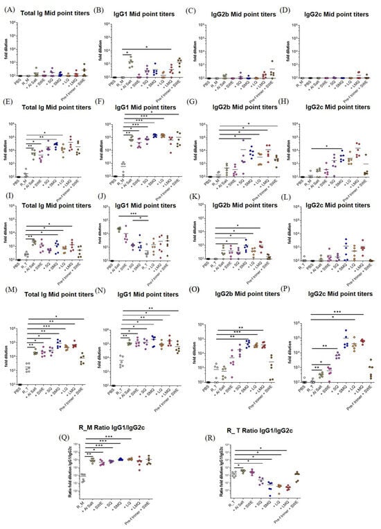 ELISA EC50 titers elicited by R_M and R_T with different adjuvants in C57BL/6 mice. Prime with R_M (monomeric RBD): (A) Total Ig midpoint titer, (B) IgG1 titer, (C) IgG2b titer, (D) IgG2c titer. Boost with R_M (monomeric RBD): (E) Total Ig titer, (F) IgG1 titer, (G) IgG2b titer, (H) IgG2c titer. Prime with R_T (trimeric RBD): (I) Total Ig titer, (J) IgG1 titer, (K) IgG2b titer, (L) IgG2c titer. Boost with R_T (trimeric RBD): (M) Total Ig titer, (N) IgG1 titer, (O) IgG2b titer, (P) IgG2c titer. The ratio of IgG1 and IgG2c ELISA titers for (Q) R_M and (R) R_T. Data are n = 6 mice per group. Statistical significance was determined on log-transformed data by one-way ANOVA with Dunnett’s multiple comparison (* p ≤ 0.05; ** p ≤ 0.01; *** p ≤ 0.001).
