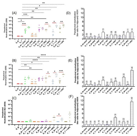 Pseudoviral neutralization titers (pVNT) elicited in C57BL/6 mice. Pseudoviral neutralization titers elicited by the various formulations against (A) WT, (B) Delta, (C) Omicron (BA.1). p values for comparisons were calculated with a two-tailed Mann–Whitney test. All sera that showed a titer of <60 were assigned a value of 60 for purposes of comparison. Relative pseudoviral neutralization titer (Titer (Adjuvant X)/) Titer (AlOH)) for the following pseudoviruses: (D) WT, (E) Delta, (F) Omicron (BA1). The geometric mean pVNT ID50 for all six animals in each group has been used in the analyses. Data are presented as individual responses of n = 6 mice with the mean (bar). Statistical significance was determined on log-transformed data by one-way ANOVA with Dunnett’s multiple comparison (* p ≤ 0.05; ** p ≤ 0.01; *** p ≤ 0.001; **** p ≤ 0.0001).