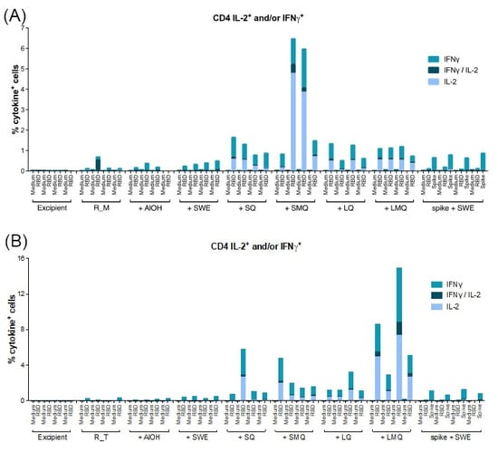 Quantification of CD4 T-cells expressing type 1 cytokines elicited by monomeric RBD (R_M) (top panel) and trimeric RBD (R_T) (bottom panel) in C57BL/6 mice. C57BL/6 mice were immunized IM on Day 0 and Day 21 with R_M (A) or R_T (B) adjuvanted with AlOH, SWE, SQ, SMQ, LQ or LMQ and sacrificed at day 28. The percentage of CD4 T-cells expressing IFNγ, IL2 or IFNγ/IL2 was determined by ICS and FACS. As a negative control, mice were immunized with excipient (PBS). As a positive control, mice were immunized with SWE adjuvanted spike protein. Data are presented as the mean of n = 4 mice per group.
