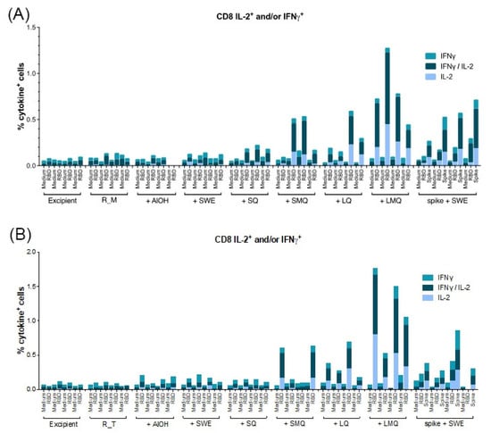 Quantification of CD8 T-cells expressing type 1 cytokines elicited by monomeric RBD (R_M) (top) and trimeric RBD (R_T) (bottom panel) in C57BL/6 mice. C57BL/6 mice were immunized IM on Day 0 and Day 21 with R_M (A) or R_T (B) adjuvanted with AlOH, SWE, SQ, SMQ, LQ or LMQ and sacrificed at day 28. The percentage of CD8 T-cells expressing IFNγ, IL2 or IFNγ/IL2 was determined by ICS and FACS. As a negative control, mice were immunized with excipient (PBS). As a positive control, mice were immunized with SWE adjuvanted spike protein. Data are presented as the mean of n = 4 mice per group.