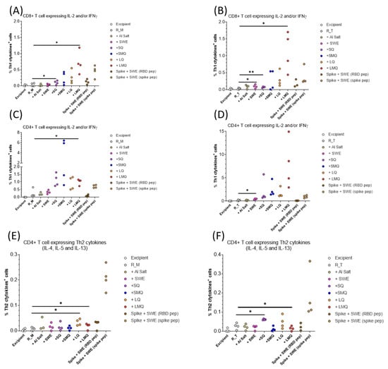 Th1 and Th2 responses in C57BL/6 mice. (A–F) Quantification of T-cells expressing Th1 cytokines IL-2 and/or IFNγ. (A,B) CD8+ T-cells. (C,D) CD4+ T-cells (E,F) Quantification of CD4+ T-cell expressing Th2 cytokines (IL-4, IL-5 and IL-13). Data are presented as individual n = 4 mice per group. Statistical significance was determined by one-way ANOVA with Dunnett’s multiple comparison (* p ≤ 0.05, ** p ≤ 0.01).