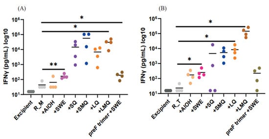 IFNγ production in splenocyte culture supernatant from mice vaccinated with (A) R_M and (B) R_T formulations containing different adjuvants.C57BL/6 mice were immunized IM on day 0 and Day 21 with R_M (A) or R_T (B) adjuvanted with AlOH, SWE, SQ, SMQ, LQ or LMQ and sacrificed at day 28. Stimulated splenocytes were measured by ELISA for cells expressing the Type I cytokines IFNγ. As a negative control, mice were immunized with excipient (PBS). As a positive control, mice were immunized with SWE adjuvanted spike protein. Data are presented as individual n = 4 mice per group. Statistical significance was determined by one-way ANOVA with Dunnett’s multiple comparison (* p ≤ 0.05, ** p ≤ 0.01).