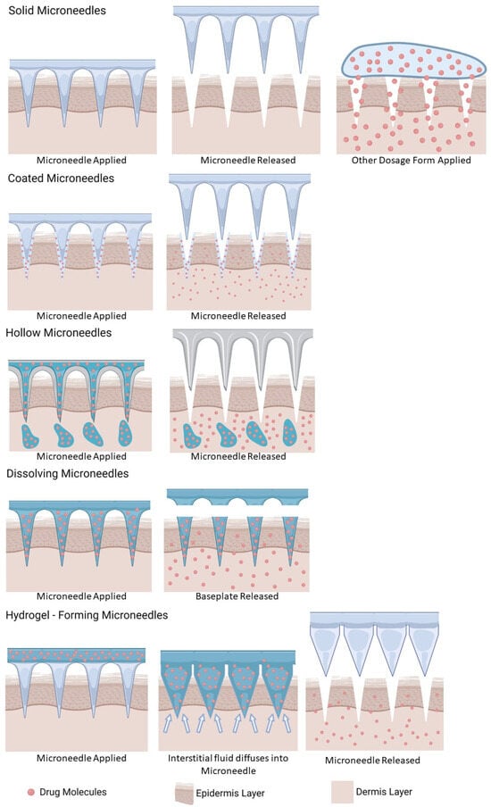 There are five types of microneedles based on their delivery systems: solid, coated, hollow, dissolving, and hydrogel-forming microneedles, which are described in Table 1 and Figure 2. The solid microneedle system is relatively simple; the needles are typically made from silicon or metal, creating micropores in the skin. Patches or topical dosage forms loaded with drugs are placed over these micropores allowing drug diffusion into skin layers [14]. However, this approach involves a two-step application. To streamline this, the coated microneedle was developed [19]. In coated microneedles, drugs are coated onto the needle surfaces. As the microneedle is applied to the skin, the drug is deposited and dissolved in the skin after insertion [14]. Coated microneedles drug formulations need suitable viscosity to remain attached to the needle surface during storage and application on the skin. However, due to the small surface of the needle, the drug content that can be delivered is limited, making it unsuitable for drugs requiring higher doses [12,14,33]. Another type is the hollow microneedle, which features a drug chamber and a needle design similar to a syringe’s needle (with a hole in the middle). This allows the drug from the chamber to flow into the skin when the microneedles are applied. The drug chamber on the hollow microneedle’s feature can overcome the previous model’s limitation by increasing the drug holding capacity [14]. Dissolving microneedles are composed of both drugs and polymers in a single unit resulting in a decreased drug loading ability [9,14]. When applied to the skin, interstitial fluid dissolves the needle, releasing the drug from the dosage form into the skin [14,34]. Lastly, hydrogel-forming microneedles have a drug reservoir that conquers limited drug-holding capacity, with the separated needle’s part made from hydrogel polymers [14]. Upon application to the skin, the needles swell as interstitial fluid diffuses into the matrix. This swelling allows drug molecules from the reservoir to diffuse into the skin through swollen needles [35]. With respect to drug loading, needle geometry also has an impact on this aspect, regardless of the type of microneedle. Drug loading can also be improved by increasing the base width, height, and shape of the needle [36].