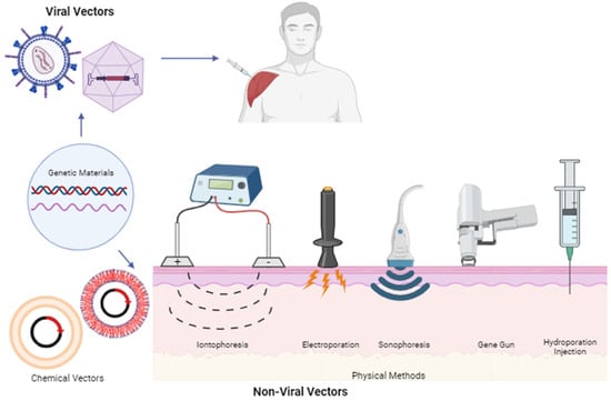 In contrast to viral vectors, non-viral vectors are delivery systems that do not rely on viruses. This category is divided into physical methods and chemical methods. The physical method encompasses techniques such as needle delivery, ballistic DNA, electroporation, sonoporation, photoporation, magnetofection, or hydroporation. Chemical methods involve carriers made from lipids (lipoplex, liposomes, or solid lipid nanoparticles) or polymers (polyethyleneimine (PEI), chitosan, or poly(lactic-co-glycolic acid) (PLGA)) [45,54]. For example, naked DNA expressing IL-12 was delivered via intramuscular injection in a mouse model to prevent angiogenesis and suppress tumor growth [55]. The helium-driven gene gun delivery of ballistic pDNA containing the Helicobacter pylori outer inflammatory protein (oipA) along with IL-2 and LTB gene plasmid induced an immune response against H. pylori infection [56]. Electroporation devices like TriGrid® (Ichor Medical Systems, Inc., San Diego, USA) enhanced antigen-specific HIV-1 production after intramuscular injection of HIV-1 pDNA in healthy human volunteers [57]. A combination of plasmids for granulocyte–macrophage colony-stimulating factor (pGM-CSF) and anti-programmed death 1 antibody (aPD-1) reduced tumor growth upon the application of ultrasound (sonication) following intratumoral injection in a breast cancer mouse model [58]. The intramuscular injection of miRNA-139-5p and anti-miR-139-5p followed by magnetic stimulation repaired rats’ internal anal sphincter (IAS) tone [59]. Minicircle naked DNA vectors containing Phenylalanine hydroxylase cDNA were successfully delivered to an inherited liver deficiency mouse model using hydrodynamic tail vein (HTV) injection [60]. Cationic lipid nanoparticles are used as vectors for Pfizer/BioNTech’s BNT162b2 vaccine and Moderna’s mRNA1273 vaccine, both delivering mRNA encoding the SARS-CoV-2 spike protein as COVID-19 vaccines [49]. Nanoparticles made from galactose-grafted PEG and low molecular weight PEI were developed as vectors to deliver the IL15 plasmid, effectively treating orthotopic hepatocellular carcinoma in a mouse model [61]. Where viral vectors exhibit higher delivery efficiency, they come with limitations, such as the patient’s immune reactions and cytotoxic effect [50]. The non-viral vectors listed above still require invasive methods and non-practical devices for effective delivery.