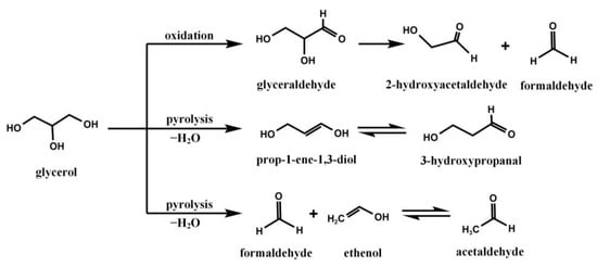 Glycerol is widely used in pharmaceutical preparations as a sweetening agent, co-solvent, humectant, or lubricant. More than 850 products, including gels, capsules, tablets, creams, syrups, and others, contain glycerol [17]. When stored appropriately, glycerol exhibits excellent stability. However, it is highly susceptible to degradation when subjected to repeated use [18]. A review of the literature reveals that glycerol degradation pathways can be categorized into anaerobic and aerobic processes. Under anaerobic conditions, glycerol primarily undergoes pyrolysis to yield formaldehyde, ethenol, and prop-1-ene-1,3-diol through various transition state mechanisms. These enols subsequently isomerize to generate acetaldehyde and 3-hydroxypropanal. In contrast, aerobic conditions may lead to the production of glyceraldehyde via glycerol oxidation, which further decomposes into formaldehyde and 2-hydroxyacetaldehyde [19,20]. The primary reaction equations are illustrated in Figure 2. These reactive impurities have the potential to induce physicochemical instability of the API.