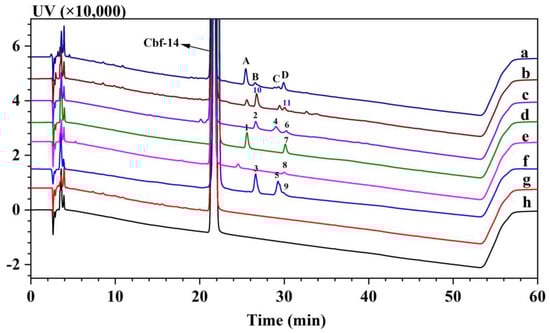 RP-HPLC chromatograms of Cbf-14 in different formulations and condensed impurities with aldehydes. (a) Cbf-14 gel (with both glycerol and methylcellulose as excipients) stored at 4 °C for 2 months; (b) formulation with Cbf-14 and glycerol alone stored at 4 °C for 2 months; (c) Cbf-14-condensed impurities with formaldehyde; (d) Cbf-14-condensed impurities with acetaldehyde; (e) Cbf-14-condensed impurities with 3-hydroxypropanal; (f) Cbf-14-condensed impurities with glyceraldehyde; (g) formulation with Cbf-14 and methylcellulose alone stored at 4 °C for 2 months; and (h) fresh-prepared Cbf-14 gel (with both glycerol and methylcellulose as excipients) (PDA extract at 220 nm). A–D: The peptide related substances detected in the gel.