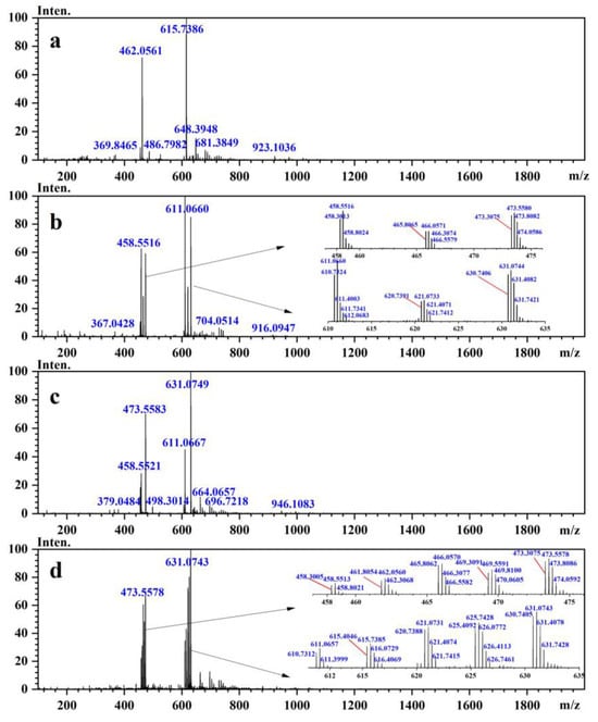 The mass spectra of the peptide-related impurities in Cbf-14 gel stored at 4 °C for 2 months. (a) Peak A; (b) peak B; (c) peak C; and (d) peak D.