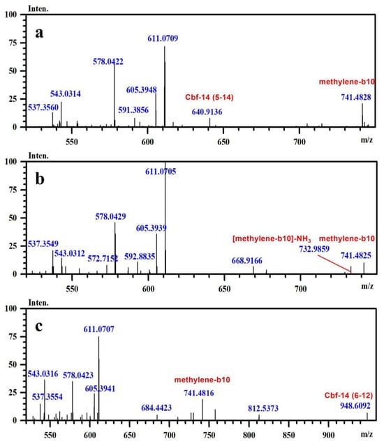 In conjunction with the secondary mass spectra, it was determined that the susceptibility sites within the Cbf-14 amino acid sequence were primarily located at the N-terminal, along with lysine residues at positions K5 and K9. For example, taking N-methylene-Cbf-14, even though the proton ions displayed identical m/z values ranging from 611.0705 to 611.0709 for impurities two, four, and six, the alkylidene sites in the Cbf-14 amino acid could be determined using secondary mass spectrometry. As shown in Figure 5, impurity two was identified as methylene-Cbf-14 at N-terminal due to the presence of a product ion at m/z 640.9136 (Cbf-14 (5–14)). Impurity four was recognized as methylene-Cbf-14 at K9, as evidenced by product ions at m/z 741.4825 (methylene-b10) and m/z 732.9859 ([methylene-b10]-NH3), while lacking product ions at m/z 640.9136 (Cbf-14 (5–14)) or m/z 948.6092 (Cbf-14 (6–12)). Impurity six was identified as methylene-Cbf-14 at K5, supported by the presence of product ions at m/z 741.4816 (methylene-b10) and m/z 948.6092 (Cbf-14 (6–12)) but the absence of a product ion at m/z 640.9136 (Cbf-14 (5–14)). Regarding N-(2-hydroxyethylidene)-Cbf-14, impurities 10 and 11 were predicted based on the primary and secondary mass spectra information displayed in Figure 4b,d and electronic supplementary material (ESM, Figure S1g,h), respectively. All other product ion spectra are provided in Figure S1, and the fragmentation pathways of the impurities are extensively elucidated in Figure S2.