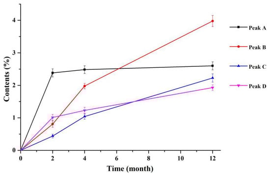 Contents of the impurities in Cbf-14 gels with different storage times via RP-HPLC. (Peak A contained impurity 1; peak B contained impurities 2, 3, and 10; peak C contained impurities 4 and 5; and peak D contained impurities 6, 7, 8, 9, and 11. Take 0.1% main component as self-compare; mean ± SD, n = 3).
