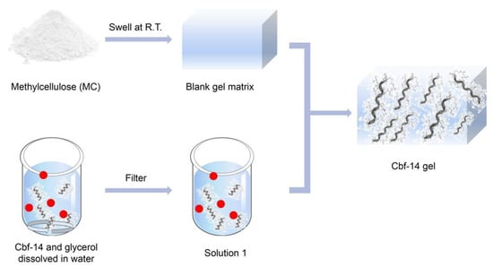 The process of preparing Cbf-14 gel is illustrated in Scheme 1. In summary, 0.2 g of Cbf-14 acetate freeze-dried powder and 1 g of glycerol were mixed and dissolved in an appropriate amount of sterile distilled water at room temperature to form solution 1. Simultaneously, 0.2 g of methylcellulose was evenly swollen in 2 g of water at room temperature for 6 h to obtain blank matrix. Finally, solution 1 was combined with the blank matrix after being filtered through a 0.22 μm filter. Water was added to achieve a final gel weight of 10 g, and the mixture was stirred until it reached a homogenous consistency.