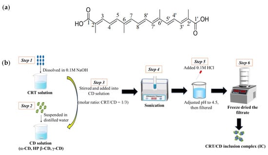(a) Chemical structure of crocetin (CRT). (b) Schematic processes for preparing CRT/CD inclusion complex (IC).