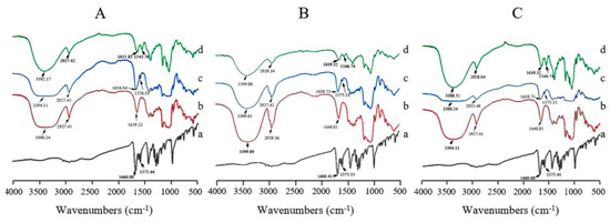 FTIR spectra of (a) CRT, (b) CD, (c) PM, and (d) IC in CRT/α-CD (A), CRT/HP-β-CD (B), and CRT/γ-CD (C) systems.