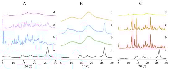To determine the solid state of ICs, a PXRD analysis was also performed. PXRD patterns of CRT/α-CD, CRT/HP-β-CD, and CRT/γ-CD systems are represented in Figure 3A–C, respectively. The a, b, c, and d in each pattern represent pure CRT, natural CD, CRT/CD PM, and CRT/CD IC, respectively. Characteristic peaks of crystalline CRT were observed at 14.17, 14.84, 17.83, and 26.31° (2θ), as shown in Figure 3. α-CD and γ-CD exhibited a series of strong and sharp diffraction peaks, indicating that these two natural CDs existed in crystalline form (Figure 3A,C). In contrast, HP-β-CD was amorphous, displaying a diffuse halo pattern, as shown in Figure 3B [38]. In the diffraction patterns of three CRT/CD PMs, peaks derived from the CRT crystal and three natural CDs were observed, which could be a simple superposition of the drug and each CD. Meanwhile, in the case of CRT/CD ICs, CRT/α-CD and CRT/γ-CD ICs mainly exhibited halo patterns, CRT/HP-β-CD ICs exhibited the same amorphous state as that of natural HP-β-CD, and no ICs showed CRT crystalline peaks. These results indicated that the crystalline structure of CRT transformed into an amorphous state in all three ICs, possibly due to the interaction between CRT and CDs [39,40]. This amorphous transformation of CRT in all three ICs was also confirmed using differential scanning calorimetry (Figure S2).