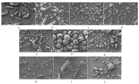 SEM of (a) CRT, (b) α-CD, (c) HP-β-CD, (d) γ-CD, (e) CRT/α-CD PM, (f) CRT/HP-β-CD PM, (g) CRT/γ-CD PM, (h) CRT/α-CD IC, (i) CRT/HP-β-CD IC, and (j) CRT/γ-CD IC.