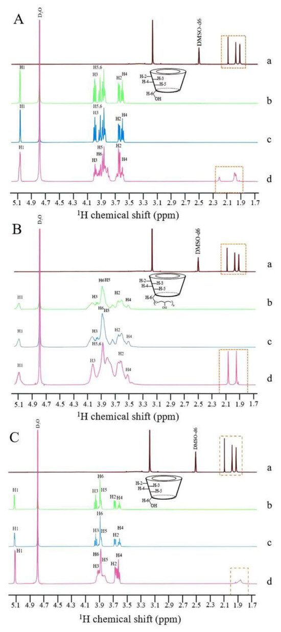 1H NMR spectra of (a) CRT (DMSO-d6), (b) CD (D2O), (c) PM (D2O), and (d) IC (D2O) in CRT/α-CD (A), CRT/HP-β-CD (B), and CRT/γ-CD (C) systems from 1.7 to 5.1 ppm.