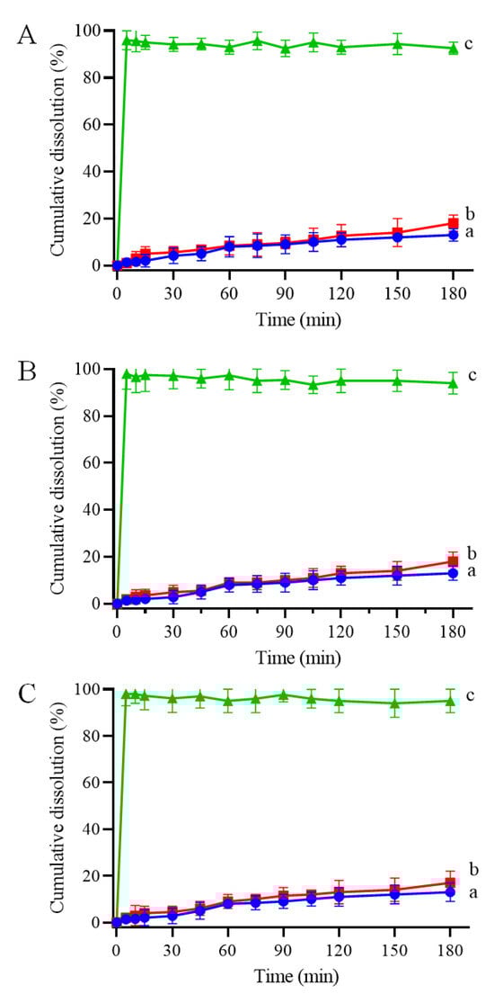 Dissolution profiles of (a) CRT, (b) PM, and (c) IC in CRT/α-CD (A), CRT/HP-β-CD system (B), and CRT/γ-CD (C) systems in phosphate-buffered solution at 37 °C and pH 6.8 (n = 3, mean ± S.D.).