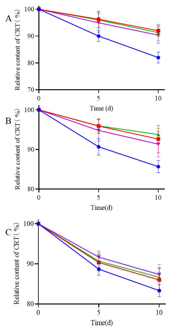 Stability was evaluated under various heat, light, and moisture conditions to investigate the effect of storage on the CRT content. The degradation curves of all samples (pure CRT, CRT/α-CD IC, CRT/HP-β-CD IC, and CRT/γ-CD IC) were determined by plotting the relative CRT content versus storage time (days) under different conditions. The storage conditions under heat, light, and moisture treatments are shown in Figure 8A–C. The relative contents of CRT and three types of ICs decreased to varying extents under all storage conditions. During thermal treatment (60 ± 0.5 °C) of CRT, the relative content of pure CRT significantly decreased to 80%, whereas ICs exhibited at least 90% retention even after 10 days. The preparation of ICs can significantly mitigate the decrease in CRT and improve thermal instability. During storage at a light intensity of 4500 ± 500 lx at 25 °C, the retention of CRT in ICs was at least 85%, slightly higher than that of pure CRT, indicating that ICs had greater stability than that of pure CRT under light conditions. During storage at an RH of 75% at 25 °C, the retention of both pure CRT and ICs decreased, although the decrease was slightly lower for ICs than pure CRT. CD may be a hydrophilic excipient that exhibits hygroscopicity under highly humid conditions. The encapsulation of water molecules affected the interaction between CD and CRT, resulting in a decrease in CRT contents in ICs [55]. During storage, CRT was degraded under heat, light, and moisture, whereas the formation of ICs could protect CRT from damage caused by these factors.