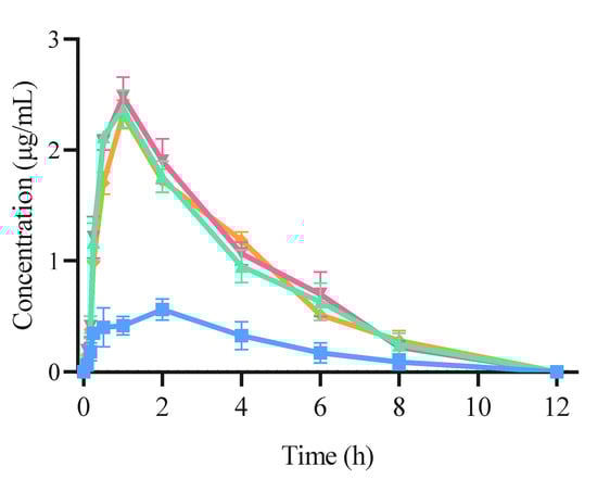 The plasma concentration–time curves following the intragastric administration of both free CRT and CRT/CD ICs are shown in Figure 9, and the main pharmacokinetic parameters are listed in Table 3. The pharmacokinetic curves of the three CRT/CD ICs were significantly better than those of free CRT, indicating that IC formation increased blood CRT concentration in rats. The peak concentration (Cmax) was 0.545 ± 0.023 μg/mL for free CRT, compared with 2.376 ± 0.118, 2.487 ± 0.126, and 2.355 ± 0.095 μg/mL for CRT/α-CD IC, CRT/HP-β-CD IC, and CRT/γ-CD IC, respectively. In addition, following oral administration (20 mg/kg), the time to reach the maximum concentration (Tmax) was 2 h for free CRT and 1 h for all three CRT/CD ICs.