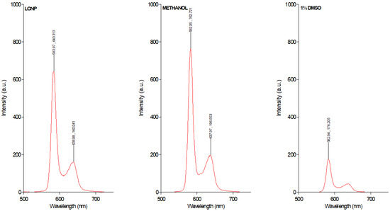 The fluorescence spectrum data demonstrate strong quenching of GaPP fluorescence peaks at 583 nm and 638 nm in GaPP dissolved in aqueous solution containing 1% DMSO, due to aggregates’ formation. On the other hand, the fluorescent peaks of GaPP dissolved in LCNP resemble those of GaPP dissolved in methanol, where GaPP occurs predominantly in the monomeric form [30], with slight reduction in the fluorescent intensity; this is ascribed to the difference in polarity between water and methanol [32]. These data agree with our previous reported results of the higher absorption coefficient of GaPP in LCNP ɛ = 57,983 M−1 cm−1 compared to unformulated GaPP ɛ = 19,689 M−1 cm−1 [22], and the higher singlet oxygen quantum yield (ϕ∆) of 0.72 compared to 0.42 with unformulated GaPP solution [17]. These data indicate the success of LCNP in solubilizing GaPP and keeping it in its monomeric form.