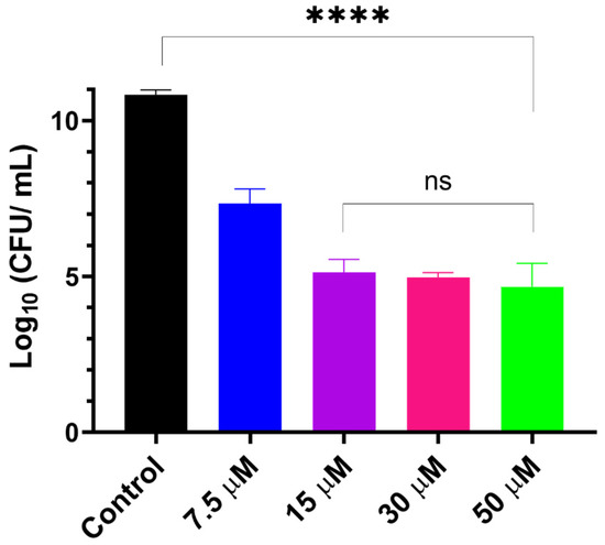 Viability of S. aureus biofilms following treatment with different concentrations of GaPP within LCNP, light dose 16 J/cm2. Data plotted as mean ± SD, n = 3. ns: non-significant, **** significant reduction in viability, p value < 0.0001 (one-way ANOVA test followed by multiple comparison Tukey’s test).