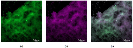 S. aureus biofilms were established in an 8-well slide chamber as previously detailed [17]. Following biofilm formation, 200 µL of GaPP-LCNP with a final GaPP concentration of 50 µM was incubated with biofilms at 37 °C for 2 h. Following incubation, GaPP-LCNP were removed and biofilms washed to remove non-adherent nanoparticles. The biofilms were stained with Syto-9 (Eugene, OR, USA) for 15 min, followed by washing and fixation using neutral formalin. After removal of the fixative solution, the biofilms were washed and dried. The biofilms attached to the glass slide were examined using confocal microscopy (LSM800, Zeiss, Oberkochen, Germany) using a 10× objective lens. The live cells within biofilms stained with Syto-9 were observed at 525 nm following excitation at 507 nm, while GaPP fluorescent signal was monitored at 585 nm following excitation at 405 nm.