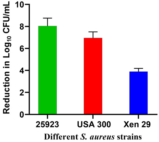 In this study, Xen29 biofilm required a higher light dose compared to our previous report against standard strains of S. aureus biofilms, where only 3.8 J/cm2 were sufficient to eradicate biofilms [17]. This was partially attributed to the susceptibility of these tested biofilms to GaPP as an iron mimetic agent [40], in addition to the strong diffusion of GaPP-LCNP through the biofilm, which adds to the antibacterial activity upon light activation of GaPP [17]. To test whether Xen29 biofilms share the same susceptibility to GaPP as an iron mimic agent, we incubated GaPP-LCNP with the three S. aureus strains (25923, MRSA USA 300 and Xen29) for 24 h in the dark, followed by CFU enumeration. S. aureus 25,923 showed the highest susceptibility to GaPP-LCNP with an 8 log10 reduction followed by USA 300 7 log10 and Xen29 4 log10, see Figure 5. The lower susceptibility of Xen29 biofilms to GaPP-LCNP can be ascribed to the difference in virulence factors among S. aureus strains [39] which significantly affects the complexity of biofilms [41]; this explains the need for higher light doses to inactivate Xen29 biofilms.