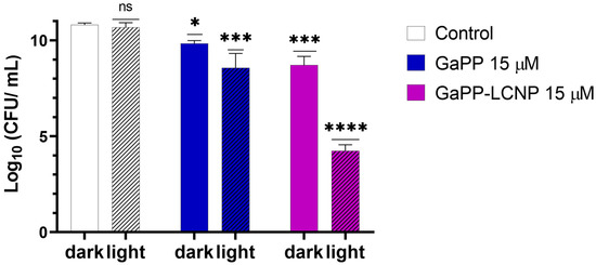 Despite the higher resilience of Xen29 biofilms to GaPP compared to previously tested strains [17], incorporating GaPP within LCNP significantly improved its antibacterial activity, see Figure 6. Following photoactivation with blue light, GaPP-LCNP reduced the viability of mature S. aureus biofilms by ~7 log10 compared to 2 log10 reduction by the unformulated GaPP solution. In addition, the antibacterial activity of GaPP in the dark was significantly enhanced; GaPP-LCNP reduced the viability of Xen29 biofilms by 2.5 log10 compared to 1 log10 by unformulated GaPP.