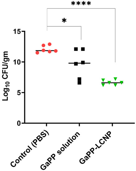 Thereafter, we compared the viability of GaPP-LCNP to unformulated GaPP solution using the same light dose and GaPP concentration, where GaPP-LCNP retained a superior antibacterial activity compared to unformulated GaPP with 5.5 log10 compared to 2.5 log10 with unformulated GaPP, see Figure 8. The difference in the activity between in vitro and ex vivo studies demonstrated the utmost importance of these studies to better elucidate the behaviour of photosenstizers in complex biological matrices and give realistic expectations of potential outcomes in animal studies.