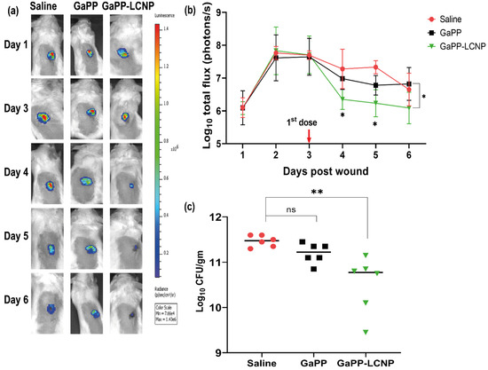 Illustration of the difference in the antibacterial activity between unformulated GaPP and GaPP-LCNP against Xen29 biofilms in infected full excisional wounds in mice. (a) Representative bioluminescent images showing infection progress in a single representative mouse from each treatment group; (b) corresponding determinations of the bacterial burden using average total flux (photons/s) showing significant reduction in the Xen29 luminescent signal following first treatment dose with GaPP-LCNP; (c) the viability of biofilms in wounds at the end point of the study after collection of tissue beds expressed as CFU/gm. Data presented as mean ± SD (three technical replicates for each wound per group, n = 6), ns: non-significant, * significant reduction p < 0.05, ** p = 0.001 (one-way ANOVA test followed by multiple comparison Dunnett’s test).
