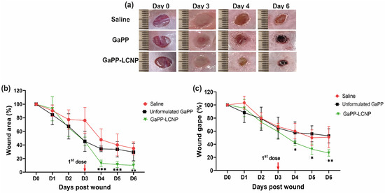 One of the positive outcomes reported with the utilization of photodynamic therapy in the management of chronic wounds is the acceleration of wound healing [15,16,20]. We tested whether photoactivation of GaPP-LCNP would have a positive impact on the wound-healing process. Firstly, macroscopic analysis, which is a routinely used approach to determine the rate of wound healing, was conducted to determine wound size [20]. The wounds were imaged daily, followed by image analysis to determine the effect of the treatment on wound area and wound gape, following established protocols [25]. Figure 10a demonstrates the prominent changes in wound morphology during the study, including the surgery day (day 0) and day 3, where biofilm infections were established on the wounds showing pus and maceration; following the application of GaPP and GaPP-LCNP, wound maceration was ceased and the wounds appeared smaller in size with skin stain red in color due to GaPP color, as previously reported with other photosensitizers [47]. The GaPP-LCNP treated group demonstrated the highest wound healing with a ~90% reduction in wound area, see Figure 10b, compared to a 60% reduction with unformulated GaPP at day 4 post-wounding; this trend continued for remainder of the study. Additionally, a similar trend was observed when measuring wound gape, where GaPP-LCNP recorded the highest reduction in wound gape after the first dose (60%) and reached 75% at the end point of the study, showing significant improvement compared to controls. On the other hand, unformulated GaPP did not show a significant reduction in the wound gape compared to saline group, with ~60% wound gape at the study end point.