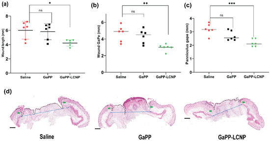 Microscopic analysis of the wound-healing process using histology analysis. (a) represents wound length, (b) wound gape and (c) panniculus gape; (d) representative histology section used for the obtained measurements; the dotted black line represents wound length, green arrows represent wound gape and blue arrows represent panniculus gape; magnification 10× H&E stain. Data presented as mean ± SD compared to control treated with saline; ns: non-significant, * p value = 0.01, ** p = 0.002 and *** p = 0.0003 (one-way ANOVA test followed by multiple comparison Dunnett’s test).