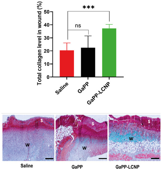 In addition to reducing bacterial burden, controlled amounts of ROS have been reported to maintain wound haemostasis and signal platelet aggregation, which stimulates the expression of adhesion molecules [49]. In addition, ROS signals the initiation of the proliferation phase following injury, promoting the expression of basic fibroblast growth factor fibronectin and collagen synthesis [50]. Previously, we have shown that ROS produced by both unformulated GaPP and GaPP-LCNP promoted the proliferation of skin fibroblasts in vitro [17]. Herein, we demonstrate increased early collagen deposition in wounds following the photoactivation process. The GaPP-LCNP group showed significantly higher early collagen content in the wound 37 ± 2.9% compared to 22 ± 9% for unformulated GaPP and 20 ± 5.7% for saline groups, respectively, see Figure 12. This is in agreement with previous studies showing the beneficial effects of aPDT on collagen deposition [51]; however, further studies are needed to elucidate the long term effect at later timepoints of tissue regeneration and scarring.