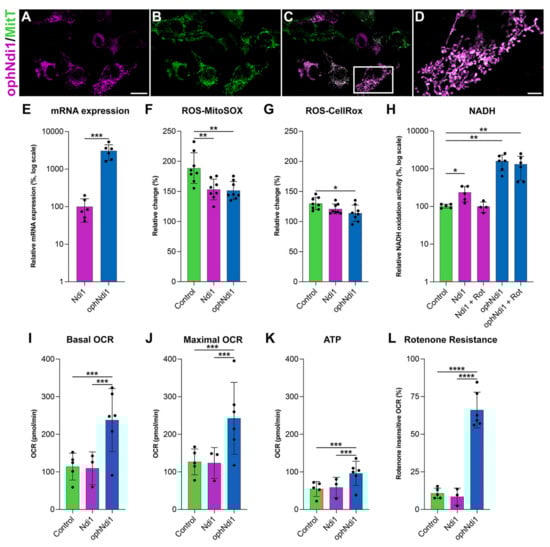 Functional analyses of ophNdi1 in vitro. To establish mitochondrial localisation of ophNdi1, HEK293 cells were co-transfected with 0.5 μg HA-tagged ophNdi1 and analysed 48 h later using Cy3-labelled HA immunocytochemistry (A) and MitoTracker™ (B); ophNdi1 and MitoTracker™ are co-localised (C,D). Bioenergetic profiles were evaluated in HEK293 cells transfected with 1 μg pAAV-MCS (control, green bars), 1 μg pAAV-NDI1 (pink bars) or the copy number equivalent of pAAV-ophNdi1 (blue bars) (E–H); or transduced with AAV-NDI1 (pink bars) or AAV-ophNdi1 (blue bars) at an MOI 3.4 × 105 and compared to untransduced cells (green bars) (I,J). Bar charts represent: (E) Relative mRNA expression levels in HEK293 cells harvested 24 h post-transfection of pAAV-NDI1 or pAAV-ophNdi1. RNA was isolated and mRNA expression analysed by RT-qPCR. Relative expression of NDI1 was assigned a value of 100. (F) Cellular (CellRox™) and (G) mitochondrial (MitoSox™) ROS levels measured 48 h post-transfection. Cells were insulted with 5 nM rotenone for 24 h prior to analysis or left un-insulted. The percentage increase in ROS between rotenone-insulted and un-insulted cells is shown. (H) The rate of NADH oxidation analysed 72 h days post-transfection, normalised to protein. Null transfected control cells, without rotenone addition, were taken to be 100%. (I–L) Mitochondrial stress test (Seahorse XFe96 Analyser, Agilent) was performed 48 h post-transduction of AAV-NDI1 or AAV-ophNdi1 (n = 5). Oligomycin (1.0 µM), FCCP (1.0 µM), rotenone (0.5 µM) and antimycin A (0.5 µM) were injected sequentially and the resultant oxygen consumption rates (OCRs) normalised to protein. Bar charts represent: (I) Basal OCR, (J) Maximal OCR, (K) ATP production, (L) Rotenone-insensitive OCR. Error bars represent SD values, * p < 0.05, ** p < 0.01, *** p < 0.001, **** p < 0.0001 (E: Student’s t-test, F–K: one way ANOVA with Tukey’s multiple comparisons post-hoc test). Scale bar (A): 20 µm, (D): 5 µm.
