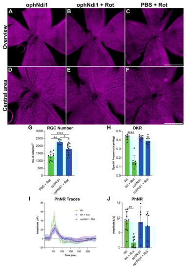 To define the preservation of retinal function afforded by AAV-ophNdi1 following rotenone insult further, the photopic negative response (PhNR) was evaluated (Figure 2I,J) two weeks after OKR analysis (seven weeks post-rotenone treatment). The PhNR is the slow negative potential following the positive b-wave in photopic electroretinography that represents RGC function. AAV-ophNdi1-treated eyes displayed significantly better PhNR amplitudes compared to control eyes following administration of 1.5mM rotenone (7.15 ± 4.90 µV and 1.69 ± 1.75 µV, respectively, p < 0.05, ANOVA; n = 6–11). Eyes treated with AAV-ophNdi1 but no rotenone and wild type eyes had PhNRs of 8.51 ± 5.15 µV and 8.88 ± 3.29 µV, respectively. Hence, eyes that received AAV-ophNdi1 prior to rotenone administration did not exhibit significantly different PhNR amplitudes to wild type and AAV-ophNdi1-treated mice that had not received rotenone insult. These data indicate that AAV-ophNdi1 has indeed provided functional benefit in the presence of the complex I inhibitor rotenone.