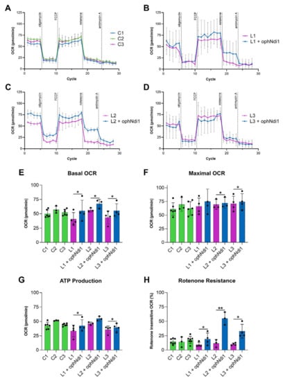 Cellular oxygen consumption rates (OCR) provide an indirect measurement of mitochondrial activity, as oxidative phosphorylation (OXPHOS) is the primary method of oxygen consumption in mammalian cells. A decrease in OCR can indicate a cell under stress. AAV2/2 vectors were generated (AAV-ophNdi1 and AAV-NDI1), as this serotype efficiently transduces RGCs following intravitreal (IVT) delivery [,]. AAV was used for subsequent in vitro and in vivo delivery, and moreover, transduction tends to be less disruptive for the cell than plasmid transfection. OCRs of transduced and untransduced HEK293 cells were compared 48 h post-transduction (MOI = 1 × 105). The basal OCR (Figure 1I) was significantly increased in cells transduced with AAV-ophNdi1 (237.97 ± 83.61 pmol/min) compared to untreated control cells (114.04 ± 35.66 pmol/min, n = 6; p < 0.05, ANOVA) and AAV-NDI1 transduced cells (109.53 ± 43.60 pmol/min, n = 6; p < 0.05, ANOVA). Furthermore, the maximal respiration (Figure 1J) was also significantly increased in AAV-ophNdi1 transduced cells compared to untreated control cells (control 126.71 ± 34.23 pmol/min and AAV-ophNdi1 242.89 ± 107.19 pmol/min; p < 0.05, ANOVA; n = 6). The spare respiratory capacity (SRC) was unchanged (ns), as both the basal and maximal rose by equivalent amounts leaving the difference between them, the SRC, unchanged.