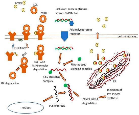 An example of such a therapeutic intervention is the drug inclisiran [64]. It is a double-stranded cholesterol-lowering siRNA, linked on the coding strand to the triantenary N acetylgalactosamine (N-acetylgalactosamine, GalNAc). The aim of this is to facilitate its uptake by hepatocytes. The RNA interference mechanism in hepatocytes is used by inclisiran to direct catalytic mRNA breakdown to PCSK9. This action intensifies the expression of LDL-C receptors and their recycling on the surface of hepatocytes and consequently enhances LDL-C uptake and reduces circulating LDL-C levels [65].