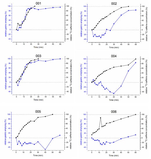 Individual relative gastric emptying (blue) and salivary 12C-caffeine concentrations (black) before and after intake of 35 mg caffeine with 50 mL of water.