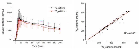 Overall, a good linear relationship between 12C-caffeine and 13C3-caffeine concentrations was confirmed, indicating that salivary 13C3-caffeine pharmacokinetics can be used for the determination of gastric emptying. This is in line with the common use of isotope-labeled drug molecules in early pharmacokinetic studies [18,19]. Nonetheless, in a recently published study, it was observed that entirely deuterated D9-caffeine yielded a 4-fold increase in AUC compared to natural caffeine, indicating that isotope labeling might sometimes indeed alter pharmacokinetics in a relevant way [31]. This was not the case for 13C labeling.