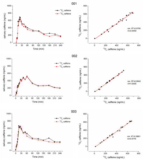 Individual salivary caffeine concentrations of 12C-caffeine (black) and 13C3-caffeine (red) on the left side and their linear correlation on the right side from subjects 001, 002 and 003.