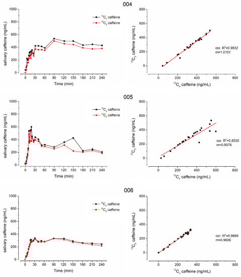 Individual salivary caffeine concentrations of 12C-caffeine (black) and 13C3-caffeine (red) on the left side and their linear correlation on the right side from subjects 004, 005 and 006.