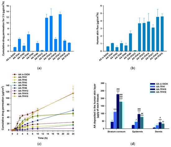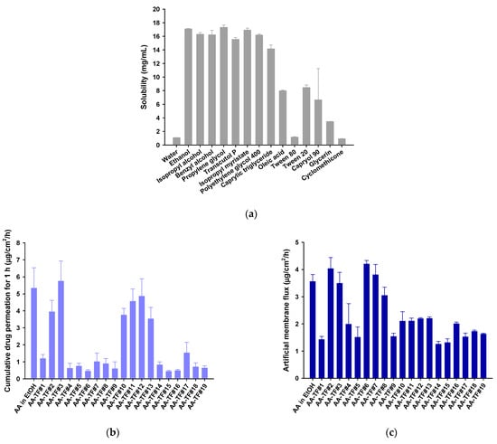 | Formulations (%, w/w) | AA | Propylene Glycol | Transcutol P | Isopropyl Myristate | Polyethylene Glycol 400 | Oleic Acid | Ethanol | Water |