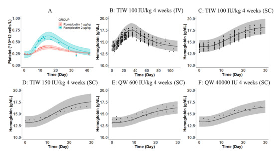 PK/PD model predicted (A) platelets following a single dose of romiplostim 1 or 2 μg/kg SC and hemoglobin following IV dose of rHuEPO 100 IU/kg thrice weekly (TIW) (B), SC dose of rHuEPO 100 IU/kg TIW (C), SC dose of rHuEPO 150 IU/kg TIW (D), SC dose of rHuEPO 600 IU/kg once weekly (QW) (E), and SC dose of rHuEPO 60,000 IU QW (F) for 4 weeks in healthy subjects. Symbols represent observed platelet and hemoglobin profiles following romiplostim or rHuEPO treatments digitized from previous reports [22,24,29,30]. The lines represent PK/PD model-predicted platelet profiles (A) or hemoglobin profiles (B–F) in blood. The shaded area is limited by the 20th and 80th percentiles of the 200 simulated model predictions.