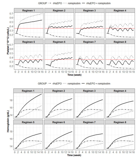 PK/PD model-predicted platelet (upper) and hemoglobin (bottom) profiles following the different dosing regimens of rHuEPO and romiplostim combination therapy in healthy subjects. The dotted, solid, and two-dash lines are the PD profiles of the rHuEPO monotherapy, rHuEPO + romiplostim combination therapy, and romiplostim monotherapy, respectively. The horizontal red line is the threshold for platelet (0.35 × 1012 cell/L).