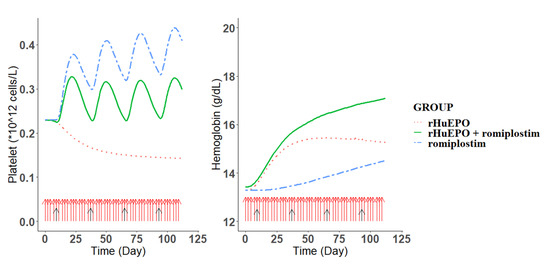PK/PD model-predicted platelet (left) and hemoglobin (right) following the recommended dosing regimen 8 (rHuEPO 50 IU/kg thrice weekly + romiplostim 1 μg/kg once every four weeks from the second week) of rHuEPO and romiplostim combination therapy in healthy subjects. The green solid line is the PD profile of the combination therapy, whereas the red dotted line and the blue two-dash line are the corresponding rHuEPO and romiplostim monotherapy PD profiles, respectively. The arrows represent the dosing events of rHuEPO (red) and romiplostim (black).