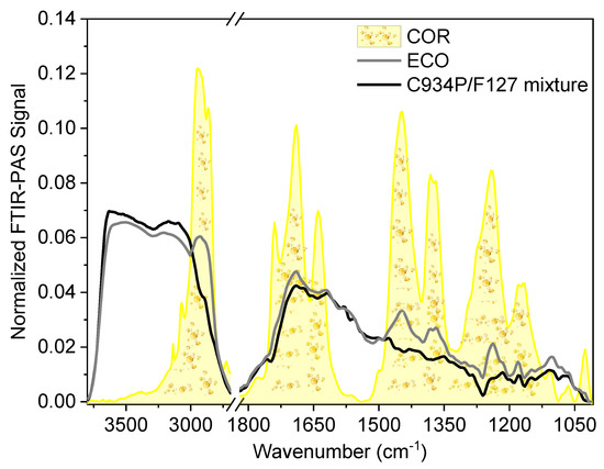 Normalized FTIR-PAS signal of the COR, ECO, and C934P/F127 mixture (without COR), acquired at 25 °C.