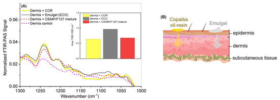 (A) Normalized FTIR-PAS signal of the COR, ECO, C934P/F127 mixture, and dermis control, acquired at 25 °C. The insert in (A) demonstrates the difference between the areas of the spectra. (B) Schematic representation of the skin permeation of COR and ECO.