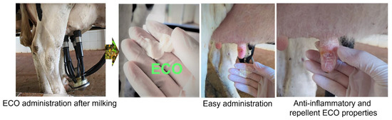 Additionally, ECO demonstrated anti-inflammatory potential through in vivo studies. ECO administration on the ceilings was easy. Furthermore, ECO spreading leads to a protective thin film over the teats (Figure 3), which acts as a natural repellent against fly proliferation (myiasis) [28].
