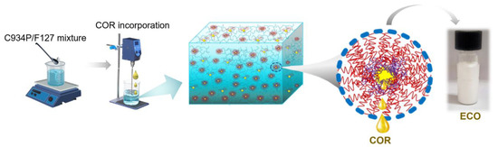 The ECO formulation was prepared by dispersing 1.2% w/w Carbopol C934P and 2.4% w/w Pluronic® F127 in water under vigorous stirring until complete homogenization occurred. Then, the pH was adjusted to 7 using TEA. Afterward, COR was slowly added until it reached 20% w/w, and the system was continuously stirred for 30 min (Scheme 1). After manufacturing, the emulgel (called ECO, a gel containing COR) was stored at room temperature. The details of the optimization and preparation have recently been published [12].