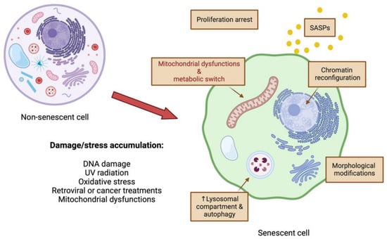 Cellular senescence is a terminal state of proliferation arrest in response to stressors or damages. Classic markers of cellular senescence are increased cell size, development of a senescence-associated secretory phenotype (SASP), chromatin remodelling, increase (↑) in the lysosomal compartment and autophagy, and mitochondrial alterations. Created with BioRender.com.